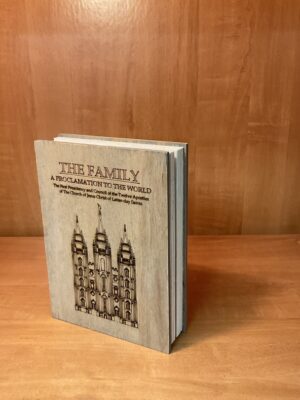 The Family – A Proclamation to the World. This is one of the most unique editions of this iconic document. It is engraved on to a 3/4 inch thick wood and made to look like a book that you can display on your mantle, dresser, or virtually anywhere you’d like. This mantle or dresser top piece will enlighten any room. It is a piece that draws attention and invites conversation. Put in on your bedroom dresser where you see it each morning and night and have quick access to review this inspired proclamation. I pay attention to every detail in its creation. The outside cover and inside are stained in 2 different tones making it look like a book. It…